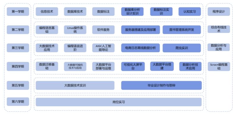 本专业面向中原经济区、平原示范区、航空港区等地区,聚焦中原农谷、智慧岛等多家数字经济相关企业,多家省级大数据双创基地,旨在培养适应数字经济时代发展需求的高素质技术技能型人才,重点培育学生掌握大数据技术全流程核心能力。通过系统化教学与实践训练,学生将具备精准分析用户业务需求并设计大数据项目解决方案的专业素养,熟练运用数据采集、抽取、清洗、转换与加载技术构建高效预处理模型;掌握主流数据分析工具的安装部署与平台操作技能,能够独立完成复杂数据分析任务;精通数据可视化设计原理,可开发交互式应用并撰写专业分析报告;熟悉大数据平台架构设计、集群部署及运维管理技术,具备平台性能优化与故障处理能力;同时掌握大数据平台管理、技术服务及产品运营等应用能力,能针对行业典型场景提供数字化解决方案。此外,本专业注重培养学生探究学习、终身学习及可持续发展的综合能力,使其成长为兼具技术深度与行业视野的复合型大数据专业人才。